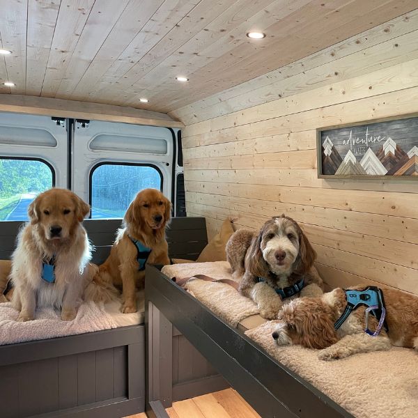 Our daycare bus runs Monday through Friday and picks up daycare dogs around town. We provide your pup with its own harness that clips into our system. We pickup between 8:00 - 8:45 am from your house and drop back off between 5:00 - 6:00 pm.