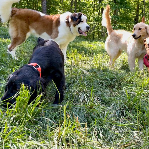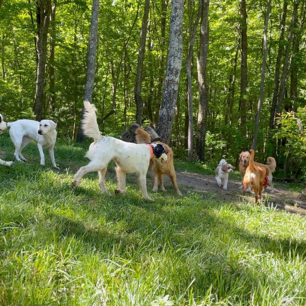 We're a small kennel and we love getting to watch our pups run and play in our field and woods pastures. Breaking dogs into small groups we rotate them throughout the day letting the smell, run, jump and play.